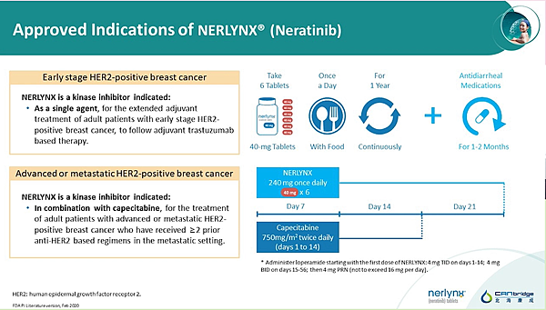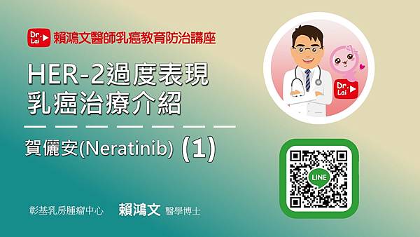 那除了在早期輔助性的使用來減少乳癌的復發,那另外一個功能主要是在於就是晚期的乳癌病人,在使用過2線以上抗HER-2的藥物之後,疾病還是進展的時候,我們可以合併用賀儷安合併泰嘉錠來使用,來治療在用2線之後還是有疾病進展的乳癌患者。