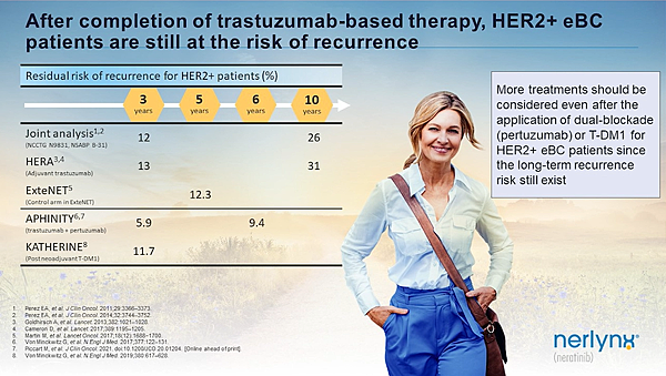 那第二就是說我們在HER-2過度表現乳癌的病人,即使使用過一年的賀癌平之後,還是有一定的病人會復發。那我們可以看到說,妳在這個HER-2過度表現乳癌使用過賀癌平之後,妳再追蹤3年、5年、6年、10年。再追蹤10年過程中,還是有26%~31%的病人會復發。換句話說,每年大概有3%的病人有可能會疾病復發,那妳怎麼樣在這個過程當中,可以讓病人減少後續復發,是目前我們在治療上一個重要的考量。