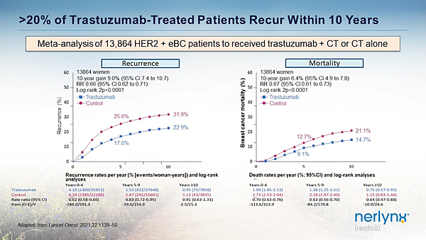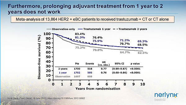 那這個是在於紅色這條線是使用單獨只有用化療藥物,在HER-2過度表現的病人。在10年來講,你會發現有將近32%的病人會復發。那藍色曲線是使用化療藥物合併賀癌平的病人。你可以發現說,在追蹤10年的過程中,還是有23%的病人會復發,代表說,雖然妳使用這個賀癌平加化療藥物,可以有效減少疾病復發。但是有一定的病人,大概將近兩成六的病人,還是會有疾病復發,那要怎麼樣減少這些病人,可能是一個重要的問題。