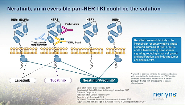 那我們今天講這個,就是【賀儷安(Neratinib)】,它是一個不可逆的鉻酸鎂的抑制劑。你會發現說HER-2就是人類上皮表皮的受體,它事實上是一個家庭,它自帶有4個成員。那一般我們講HER-2就是指第二型上皮的受體。你會發現說我們過去我們講的像賀癌平,它就接在第四的一個位置,它可以抑制這個訊號往下移動。那我們講雙標靶治療是指像這個賀疾妥,它就接在二的位置,它可以避免第二個HER-2跟這個HER-3的結合,可以進一步減少疾病的復發。那我們講的像賀癌寧,或者是像優赫得這些比較新的藥物,這種標靶治療像新的導彈型標靶治療,它就接到4的一個位置。