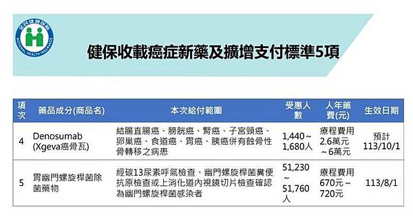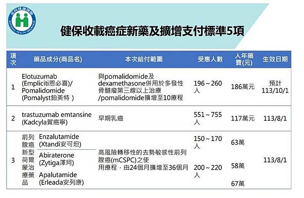 健保收載癌症新藥及擴增支付標準5項。(健保署提供)