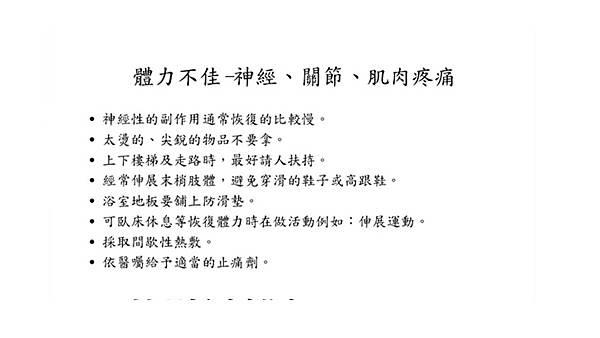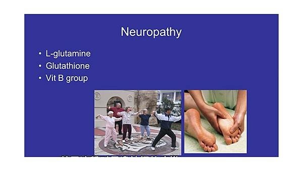 甚至這種叫周邊神經的病變,因為這個事實上很多病人打都會手會麻,這跟化療相關,像打歐洲紫杉醇、太平洋紫杉醇或是妳打那個賀樂維或是那種長春鹼,像那個溫諾平或是易莎平這個東西跟那個神經引起的傳導有關的化療物,事實上都會引起這個周圍神經的的麻木,那妳怎麼去改善,可以吃一些像保養品或者像B群或是L-glutamine,這個本身來講事實上可以改善這個周邊神經麻痺,或者說妳練太極作適當運動,這也可以緩解這個東西。