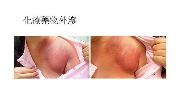 另外就是化療引起的滲漏,有時候大家知道人工血管,妳打化療、打人工血管,所以不小心滲漏出來,這個皮膚也造成這個紅腫,有時候很難處理,甚至引起這個蜂窩性組織炎的問題。