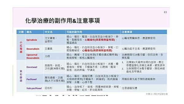 這是最後幾章簡報整理說,其實化療有哪些副作用,其實講到這邊大家都眉頭都深皺,說好像這個化療藥是很恐怖,能不打就不打,是沒錯啦,只是有些病人她還是需要說,還是需要適當的打一些化療藥物,以目前我們整理就是說小紅莓像這種泛艾黴素,這種Doxorubicin就是艾黴素,微脂體小紅莓叫力得,那產生的副作用像這個噁心、容易掉頭髮這個都是常見的,甚至微脂體小紅莓,可能大家就說打小紅莓,大家要注意有沒有心臟毒性的問題,那紫杉醇類,剛剛有講就是包含像歐洲紫杉醇、太平洋紫杉醇或者是亞柏杉,亞伯杉是比較新的太平洋紫杉醇,這類型可能就紫杉醇的部份妳可能要注意,除了噁心嘔吐之外,最主要是骨隨抑制導致血球掉比較多,打歐洲紫杉醇白血球比較容易掉的情況。那太平洋紫杉醇比較容易周邊神經麻木,那這個亞伯杉是比較新型態的太平洋紫杉醇,它事實上副作用事實上有減少,不過有些病人比較明顯就有周圍神經麻木的情況。