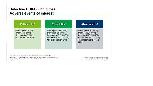 最後跟大家講叫做CDK4/6抑制劑,目前來講大家很耳熟,像愛乳適啊、擊癌利、捷癌寧,那有些病人會有血球降低、肝功能增加或是一些心臟有些異常的情況,這個可以跟妳醫師討論說吃CDK4/6抑制劑要注意哪些注意事項。