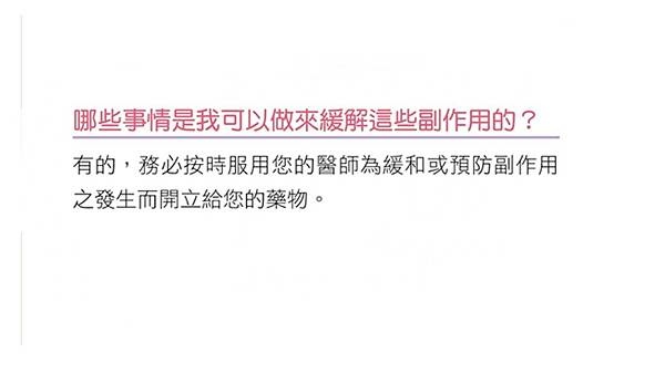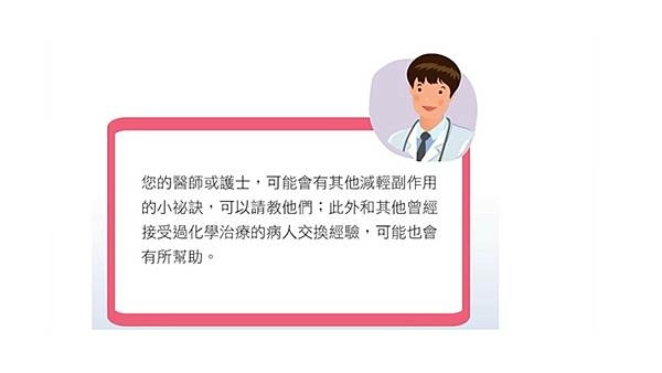 妳有任何副作用可以跟醫生反應,適當跟護理人員跟醫生反映說妳有這些副作用可以減緩,另外大家如果說妳本身,現在其實是社群媒體年代,大家每個人人手一支手機,如果說妳覺得有什麼東西不知道要怎麼查,我實際上這幾年是花蠻多時間,有去做一些社群媒體,像希望能夠服務大家,比如臉書、部落格或line群這些相關資訊,如果妳有一些藥物上面的一些諮詢問題,其實我上面列蠻多相關的東西,如果說大家有問題可以在這邊搜尋相關的資訊,以上演講,謝謝大家。