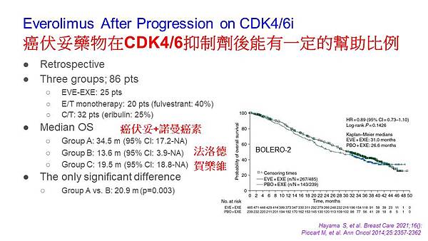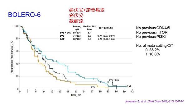 那我們之前也提過一個臨床試驗叫BOLERO-2,那後來他們做了另一個臨床試驗叫做BOLERO-6,他是想去看說我使用癌伏妥(AFINITOR)跟諾曼癌素(Exemestane)是不是可以單獨使用癌伏妥或是一定要合併諾曼癌素才可以看到效果,另外他還想去測試一個假說是荷爾蒙受體陽性乳癌是不是使用化療藥物的效果會比較不好,他想要問幾個問題第一個是癌伏妥是不是可以單獨使用還是一定要加上諾曼癌素?第二個在荷爾蒙受體陽性乳癌的病人轉移了後使用化療藥物的效果會不會比較差?這個臨床試驗你可以發現說藍色的曲線是單獨使用截瘤達(Xeloda)中間的曲線是使用癌伏妥加諾曼癌素,最差的黃色曲線是單獨使用癌伏妥,可以發現說單獨使用癌伏妥它的效果是最差只有6.8個月,使用癌伏妥加諾曼癌素可以到8.4個月,所以這個研究證實了說假設你使用癌伏妥他比較適合合併諾曼癌素使用就是說他比較適合合併一個抗荷爾蒙藥物,這是目前來講他會建議合併使用的一個依據.另外他原本想證實說荷爾蒙受體陽性轉移性乳癌使用化療藥物的效果可能會比使用荷爾蒙藥物差,後來發現說使用截瘤達得到的中位疾病進展時間可以有9.6個月好像使用這個截瘤達的效果也不錯,所以目前來講研究當初是說可能是個體使用的結果,不過這也提供我們一個暗示說這群病人使用化療效果也不見得就不好,假設我們原本是使用CDK4/6抑制劑的病人你後來疾病進展也可以考慮使用化療藥物也是一個合理的選擇。