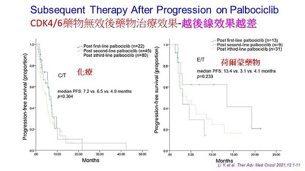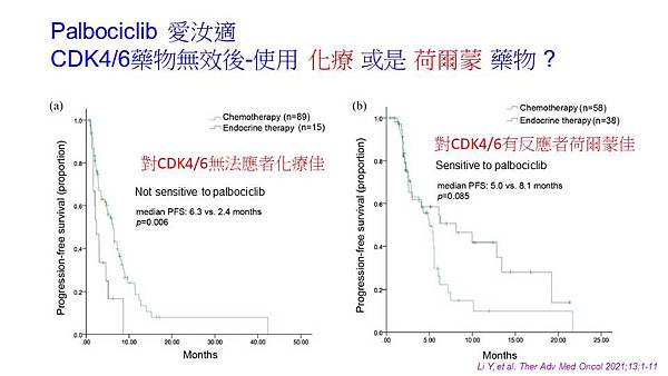 那如果說我們進一步分析原本你使用CDK4/6抑制劑,他本身是沒有反應的話那這群病人你去使用化療藥物效果就會比較理想,換句話說你一開始使用荷爾蒙藥物就沒有效的,你可以建議直接跳到化療藥物是一個比較理想的選擇如果你一開始使用CDK4/6抑制劑是有反應的,你再給他使用抗荷爾蒙藥物可能效果會比較理想,就是說你根據你第一次治療到底有沒有效來決定要使用化療藥物還是荷爾蒙藥物是一個方向。