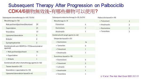 那到底我們使用CDK4/6抑制劑進展之後有哪些藥物可以使用,可以發現說其實不管是化療藥物單獨使用或是合併的化療藥物,使用單獨的荷爾蒙藥物或是合併的荷爾蒙藥物其實有很多藥物都可以考量。