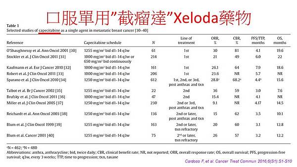 那我們剛才講說口服的化療藥物事實上在一些研究看起來好像效果也不錯,那這些病人也是跟目前吃的口服荷爾蒙藥物一樣在家裡就可以使用,那是不是這些病人就可以考慮使用口服的化療藥物來治療,那大家在門診可能過去也使用過像是口服的截瘤達,這個藥物好像在門診大家常用其實我們從文獻的分析上來看可以發現說,事實上有很多文獻的報導口服截瘤達的使用,那可以發現說截瘤達它的使用效果,其實從不同的文獻報導他得到的有效反應也不一樣,從兩成到三成多將近四成都有人報導這是有效反應的比例。